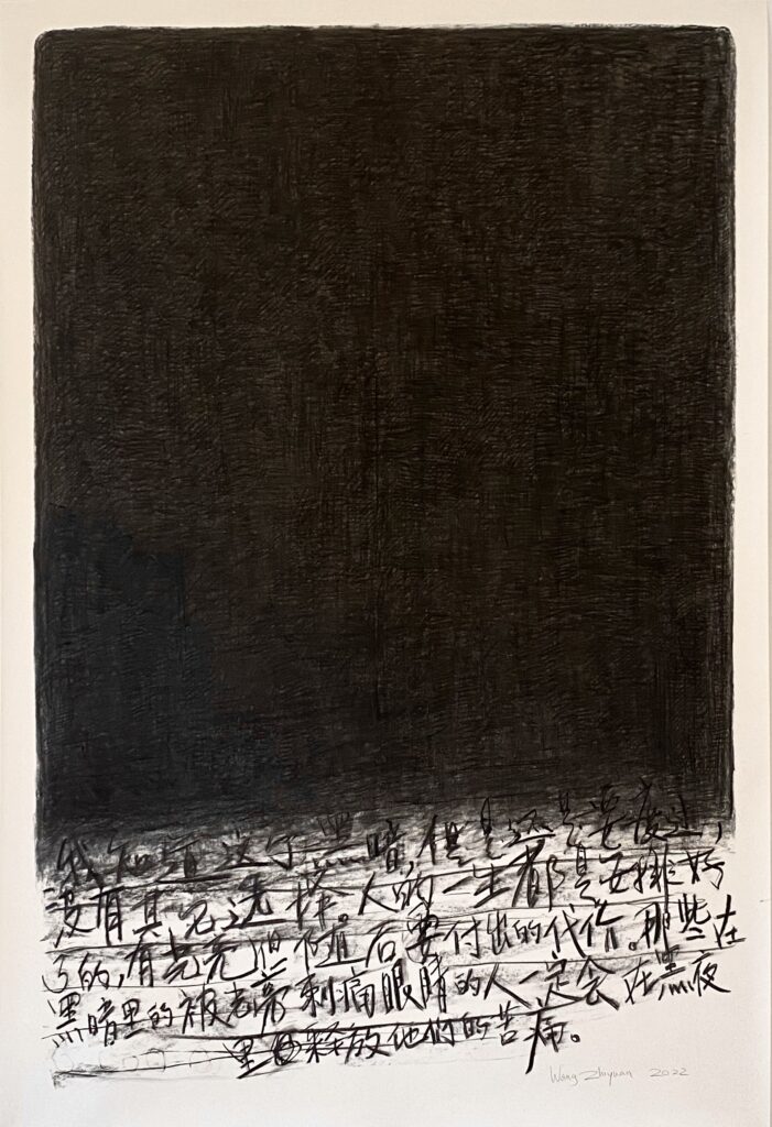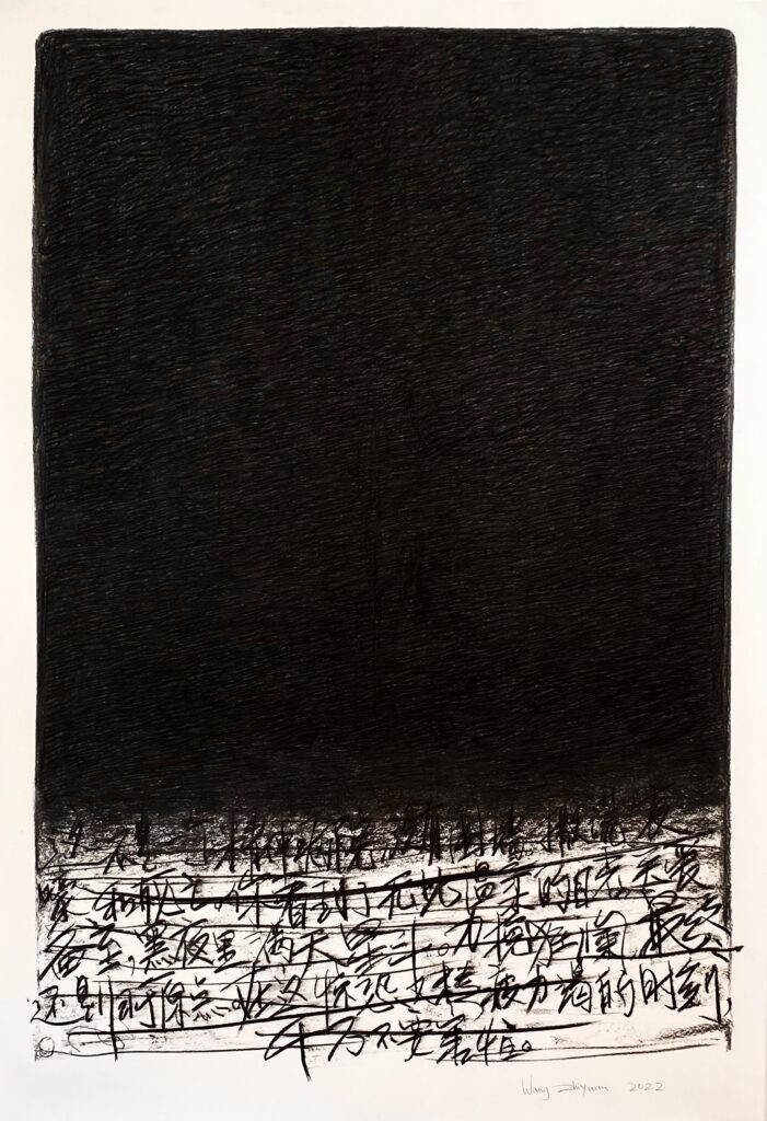 Unlike most artists who use the form of Chinese characters to evoke Orientalism, evidently, Wang’s contemplation transcends mere cultural encounters. Instead, this view towards darkness originates purely from his individuality. Thus, these characters are meaningful and recognizable inscriptions, making this piece a fusion of text and imagery. The meanings of these characters are neither explicit, nor as abstract as those found in stream-of-consciousness novels. For instance, ” I know the darkness yet still must pass through it because there is no choice. One’s life is predetermined, and for light there’s a price. People in the dark with eyes pierced by the light will release their pain into the dark night. ” ” Beauty like the setting sun, you should leave. Let the wild wasteland give solitude to the dead. Let it go, it’s just an extra gift, the suffocation of the wild wind can no longer move far away. I know the darkness can’t leave and circles to start again. ” These words seem to resonate with the traumatic, rather than optical and progressive modernism he experienced in his youth, or, an inheritance from the modernists such as Goya, Blake, Baudelaire, extending to Hai Zi (1964—1989) and Gu Cheng (1956—1993).