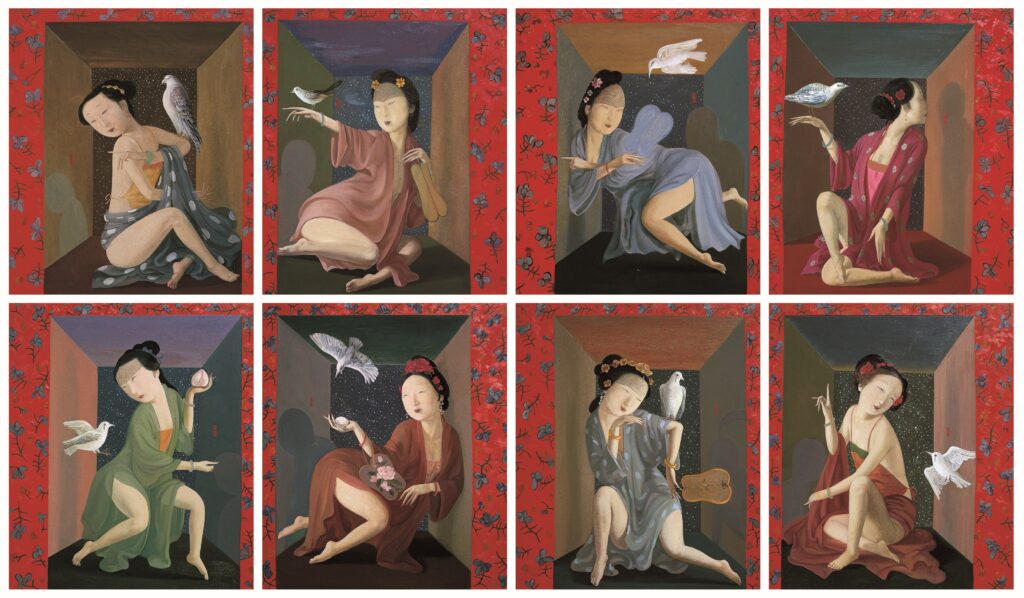 The oil painting series “Beauties Captures in Time” completed by Wang in 1994, consisting of eight works, is a combination of appropriation and the tradition of “Spring Palace Paintings” (erotic art) that emerged in the Ming Dynasty in China (fig. 7). However, it should be noted that Wang does not harbor any obsession with Chinese tradition. It is worth noting that as an artist with a racial identity living in Australia, he experienced two fundamentally different yet somewhat related parallel “movements” in the 1990s compared to contemporary artists on the mainland. He did not engage in the “Political Pop” movement in mainland China during the 1990s and early 21st century, which received considerable acclaim primarily from the West, notably the United States. Instead, he diligently searched for traditional cultural resources in China from the other side of the Pacific Ocean. The principles of identity politics in contemporary art are not difficult to understand, and Wang Zhiyuan is very honest about it. However, “identity” meant different things for artists on the two sides of the Pacific Ocean at that time: for those of his generation living in China, the most prominent identity in the 1990s was not merely “Chinese,” but rather Chinese who had just experienced a major catastrophe, years of isolation, and political “turmoil” in the aftermath. On the other hand, Wang Zhiyuan’s identity persona across the ocean was that of a traditional Chinese person who had recently cut off his queue. If 1990s Chinese culture was a rapidly spinning kaleidoscope, then Australia at the time was an era where multiculturalism was seen as trendy fashion.
