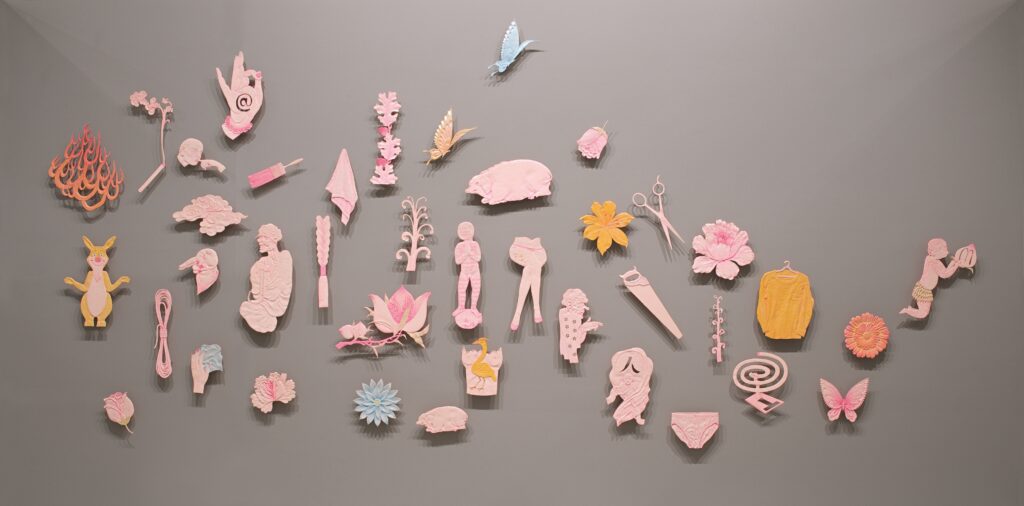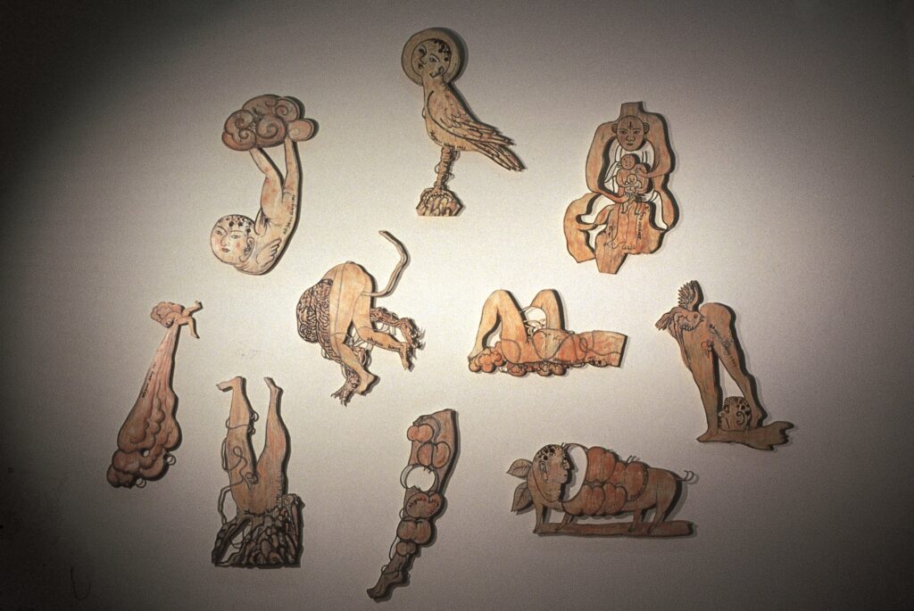 In his “Happiness” (acrylic on canvas), Wang continues the approach of blending the Chinese identity with postmodern and multicultural logic, presenting themes of gender diversity. The subsequent wall sculpture “One Gives Birth to Two” (fig. 8) can be seen as Wang Zhiyuan’s summary of his self-oriental identity phase before the arrival of the new millennium. Although the name of this series is derived from Laozi’s “Tao Te Ching,” it is actually a wildly imaginative creation by Wang under the influence of Eastern imagery. It combines elements of surrealistic humor, abstract figures reminiscent of Chen Hongshou (Ming Dynasty painter), and the grotesque creatures found in the “Classic of Mountains and Seas,” yet its origins are not tied to any specific text. This work marks a turning point in Wang’s fate in Australia. In 1997, he participated in the influential exhibition “IN AND OUT: CONTEMPORARY CHINESE ART FROM CHINA AND AUSTRALIA,” jointly curated by Huangfu Binghui and others. This caught the keen interest of Richard Dunn, the Dean of Sydney College of Art at the time, who proposed that Wang pursue postgraduate studies at the college. However, this would happen two years later.