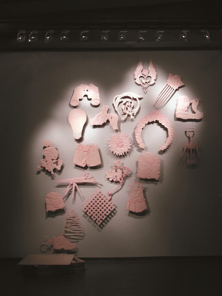 Wang Zhiyuan’s thesis project is a set of 40 MDF (Medium-Density Fiberboard)wall reliefs titled “Fragments” (2000). The images, whether new or old, all come from the vast world of his life and everyday experiences: symbols like the “@” sign representing the internet, mosquito coils, Australian kangaroos (logos), brushes, religious figures, stylized clouds, flowers, butterflies, women’s underwear, and more (fig. 9). These images are not original to Wang; they are all ready-made products. However, Wang Zhiyuan changes their colors and contexts, and translates the original meanings of these symbols (items) through arbitrary combinations. This is precisely the intention of Wang Zhiyuan’s work: to question the sacred status of originality through appropriation. Similarly, “Magic Box” (2001) also adopts the form of wall reliefs, but at the base of the displayed wall, there is a box, indicating that all these daily ready-made symbols or object graphics “fly out” from there. The mixing of ancient and modern, Eastern and Western elements illustrates that this is the Pandora’s box or Aladdin’s lamp of postmodernity, which is fascinating, enchanting, and irresistible (fig. 10).