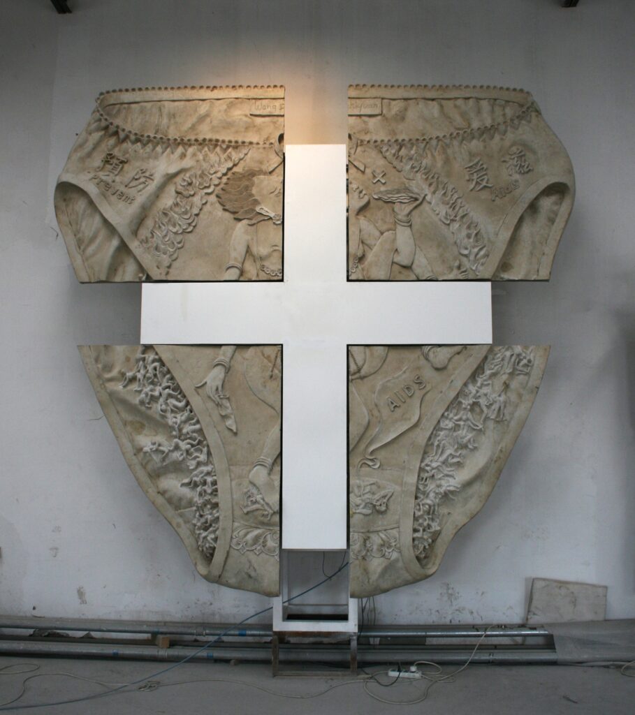 From Wang’s work in the years following, he seems to place more interested in women’s lingerie (fig.11). This interest has been prevalent in his work since his return to China from Australia in 2001, spanning another decade. It’s understandable that Wang’s generation of Chinese may find more creative freedom in an environment that tolerates the expression of erotica, having grown up in a time that was repressive of human nature. Furthermore, women’s lingerie symbolizes intimate desires in a private environment, a stark contrast to collectivism. In Wang’s youth, pornography was sinful; for instance, a “moral issue” was the quickest and least costly way to stigmatize political dissidents. From “Petite bourgeoisie sentimentality” (10), “hedonism” (11), to the ” languid tunes”(mi mi zhi yin) of the 80s (12), individuality, or rather humanity, was constantly suppressed in the name of pornography. More precisely, the purpose of setting pornography as taboo was not the goal; rather, the elimination of individuality was the true aim of collectivism, which Wang’s lingerie series directly confronts. He magnifies and exaggerates lingerie, making elaborate statements with them. When Wang began his lingerie series, he mainly juxtaposed domestic and foreign images in a playful manner on wall reliefs, such as Marilyn Monroe with a Chinese dragon, a Qing Dynasty-style beauty with Picasso’s women, and contemporary themes like AIDS and rocket launches. For instance, to maximize the explosive feeling caused by merging intimacy with publicity, he enlarged a previous sculpture featuring an AIDS-themed lingerie piece into four parts and installed a multimedia installation with a timed program; the piece would automatically open and close at set times during the exhibition, revealing a cross-shaped structure with video content (“Behind the Underpants,” 2008) (fig. 12).
